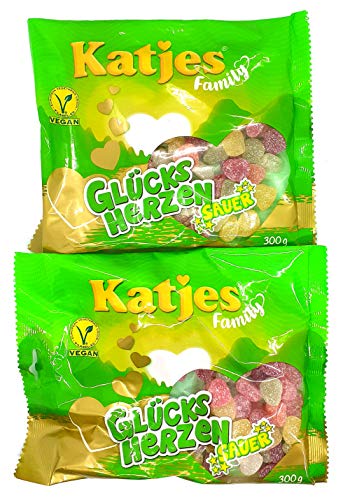 Sie erhalten 2 Packungen Katjes Glücksherzen sauer à 300g.